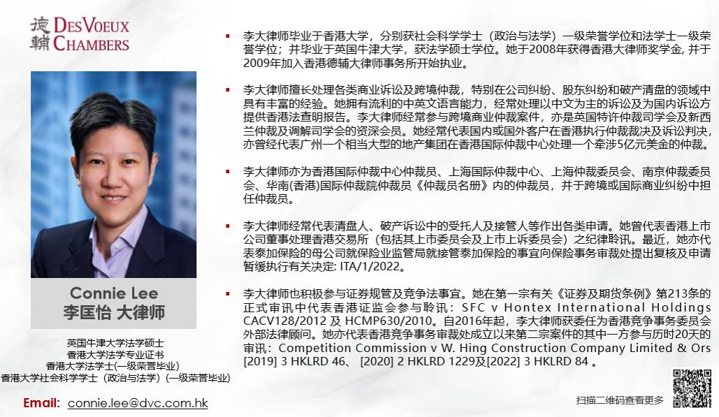 李大律师毕业于香港大学,分别获社会科学学士(政治与法学)一级荣誉学位和法学士一级荣誉学位;并毕业于英国牛津大学,获法学硕士学位。李大律师擅长处理各类商业诉讼及跨境仲裁,特别在公司纠纷、股东纠纷和破产清盘的领域中具有丰富的经验。
