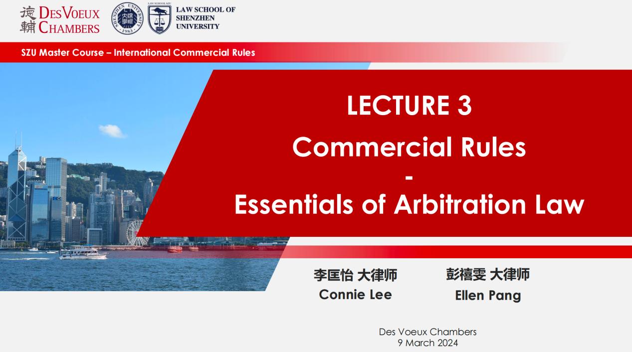 “德辅法学课程”是香港德辅大律师事务所为深圳大学与深圳国际仲裁院联合培养的国际仲裁法律硕士项目捐赠的系列公益课程,包括“国际商事规则”必修课和其他专题课程。3月9日,“国际商事规则”课程迎来第三讲。香港德辅大律师事务所李匡怡大律师(Connie Lee)和彭禧雯大律师(Ellen Pang)就“仲裁法精要”开展专题授课。