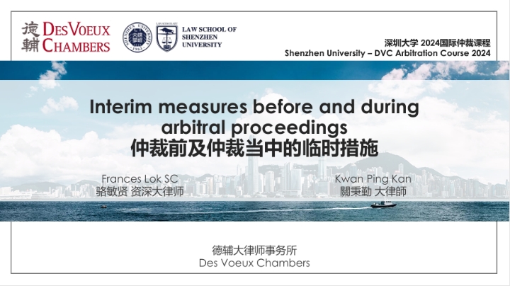 2024年9月21日,香港德辅大律师事务所的资深大律师(Frances Lok SC)骆敏贤和關秉勤大律師大律师(Kwan Ping Kan)共同为深大法学院国际仲裁法律硕士带来了“德辅法学课程”之“仲裁前及仲裁当中的临时措施”。