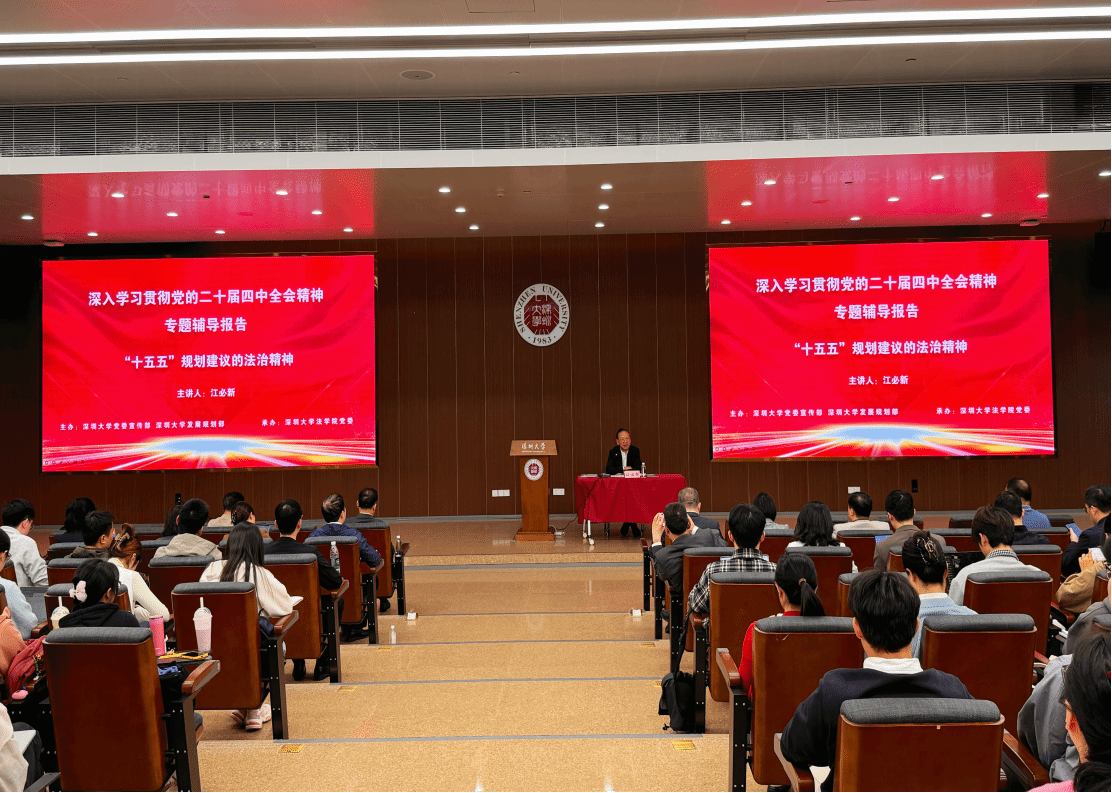 2025年11月27日下午,由深圳大学党委宣传部、深圳大学发展规划部主办,深圳大学法学院党委承办的“深入学习贯彻党的二十届四中全会精神”专题辅导报告于深圳大学丽湖校区启明楼D101报告厅成功举行。第十三届全国人大宪法和法律委员会副主任委员、湖南大学特聘教授江必新以《“十五五”规划建议的法治精神》为题发表演讲。本次报告由深圳大学法学院院长熊伟主持,法学院党委书记马文泽、党委宣传部副部长杨振宇、发展规划部王兆丁以及深圳海关、龙岗区委党校以及深圳大学法学院众多师生到场聆听,现场交流气氛热烈。