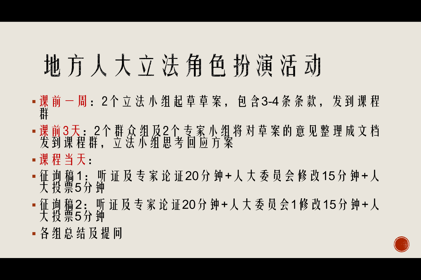 赵桃桃,深圳大学港澳基本法中心助理教授,深圳市海外高层次人才及南山区领航人才。2020年以独立完成人获得广东省在线教学“课程类”二等奖,2020年获得深圳大学省级教学奖励认定,2021年获得深圳大学课程类教学奖等一系列教学成果。思政试点《中华人民共和国宪法》课程深度结合思政教学原则,以习近平法治思想为指导,将“全面依法治国基本思想”深度融入到课程教学环节当中。其中,试点课堂“立法过程角色扮演-人民代表大会制度”安排同学们分组扮演地方人大立法过程中的主要角色,如立法委员会、专家及群众代表,并在课堂中模拟立法流程,包括草案的撰写、意见征询、讨论及草案的修改等程序。该案例将教学与思政原则有机结合,同学们将深入理解宪法中的人民代表大会制度及“全面依法治国”理念。