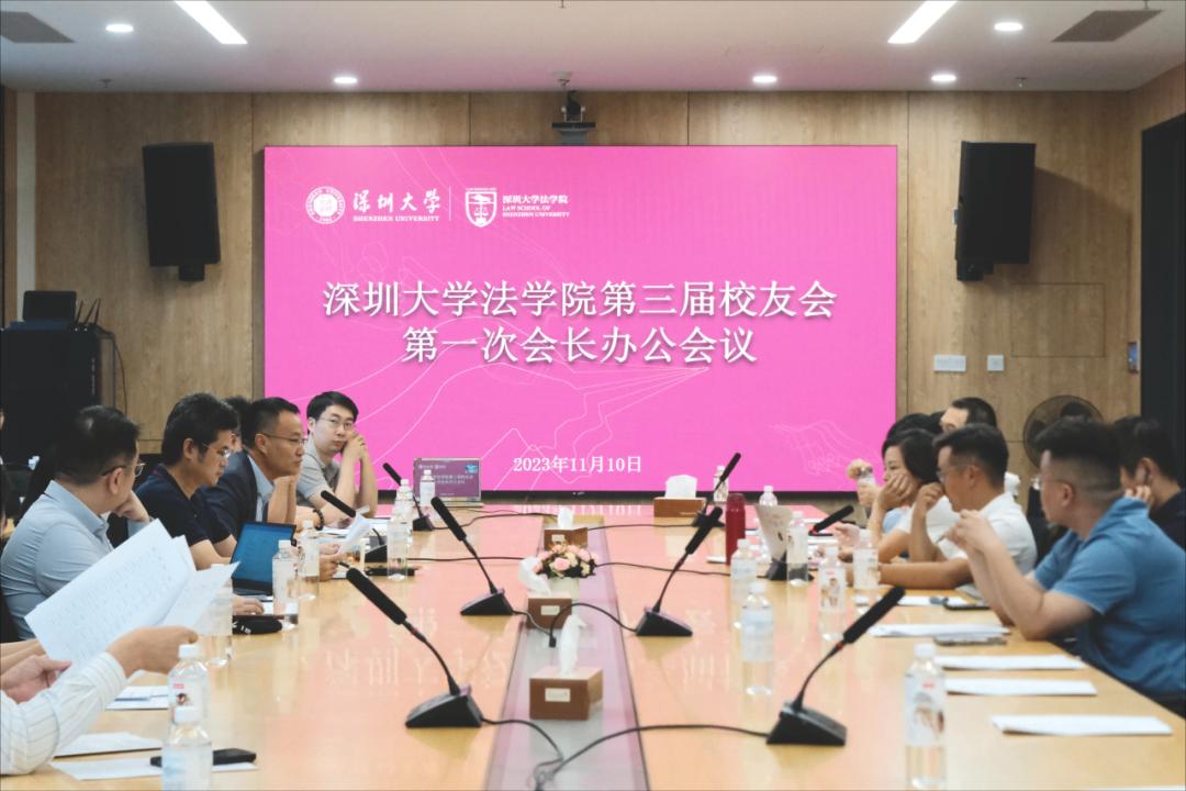 2023年11月10日下午,秋风和煦,碧空如洗,深圳大学法学院第三届校友会第一次常务理事会暨会长办公会在深圳大学丽湖校区明律楼顺利召开。本次会议分为两大部分,第一部分是常务理事会,第二部分是会长办公会,这次大会亦是新一届校友会成立以来的首次重要会议。