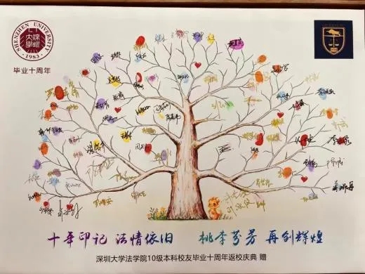 10级的校友们向法学院赠送10年入学纪念校服、毕业10周年纪念服、祝福树。祝福树上有10级校友的签名及手印,代表着同学们的根在法学院,从学院出发,奔向五湖四海、全国各地,也深深地祝福学院桃李芬芳、再创辉煌。