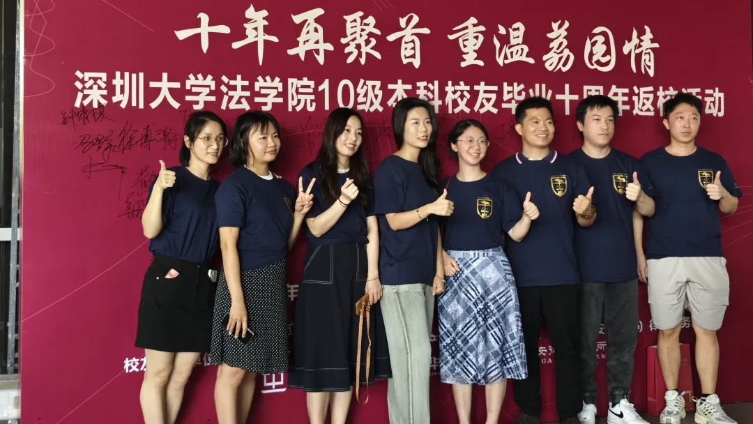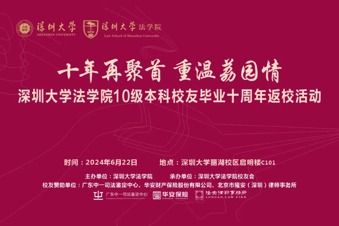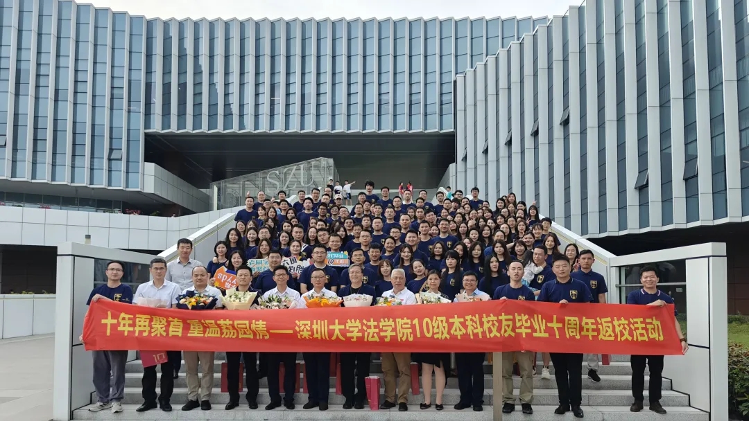 十年再聚首,重温荔园情。2024年6月22日,恰逢深大开放日+荔枝文化节,深圳大学法学院2010级本科生毕业十周年返校庆祝活动于丽湖校区隆重举行。校友们与学院领导、老师欢聚一堂,共同回顾青春岁月,展望美好未来。深圳大学丽湖校区管委会主任阮彬,法学院党委书记马文泽、副书记林济霖、副院长周卫,教师代表尹玉海、叶卫平、林伟强、杨剑、唐咏,10级辅导员刘钧,法学院校友会副会长吴昊,以及150多名校友参加了活动。活动由10级校友陈嘉伟主持。
