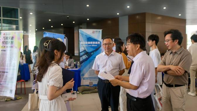 本次招聘会,学校和学院领导对本次招聘会给予了高度重视,副校长汪永成;福田区司法局局长王显军、副局长陈冰、区社会法治促进科科长张颖;深圳市律师协会福田律师工作委员会、福田区香密湖街道、福田区公证处、南天司法鉴定所和多家律师事务所领导;深圳大学学生部部长陈云飞、副部长罗绍武;经济学院党委副书记张建华、政府管理学院党委副书记张国强和多位校、院负责就业工作老师;法学院院长熊伟、院党委书记马文泽、副书记林济霖、副院长陈梦等亲临招聘会现场,积极询问了解参会单位的招聘情况和用人需求,与求职毕业生进行了亲切的交流。汪校长将此次招聘会咨询形象地比作是一次“挖宝藏”的活动: “每一家单位都是一个神秘的宝藏,而勇敢咨询是打开宝藏的钥匙 ”,鼓励同学们积极询问、巧寻至宝。领导老师与毕业生的积极互动,给此次招聘会增添了浓浓的人情味。