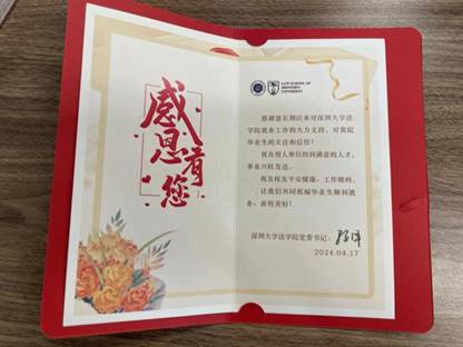 法学院党政班子大力支持人才培养和毕业生就业工作,在招聘会开始前,组织了与福田司法局人才协同培养签约仪式、与七家校外实习基地集体授牌仪式和人才协同培养座谈会。为让学生积极响应招聘和就业工作,学院副书记带领学生工作团队,到访学生宿舍并发送参会单位简介和岗位招聘须知小册子,让学生提前了解并做应聘准备;招聘会现场准备了温和可口的茶水,热情服务、其乐融融;为感谢招聘单位的参会,学院还给每个单位送出了由马文泽书记亲自签名的感谢信。