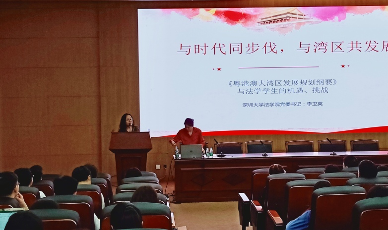 李卫英书记讲授的主题是“与时代同步伐,与湾区共发展”,讲述《纲要》出台后,法学学生面临的机遇与挑战。分别从粤港澳湾区的孕育过程、特殊性和矛盾性,探讨在此背景下,作为大湾区中的深大法学学子所面临的机遇,鼓励他们做好个人学业、职业发展规划,使自身的成长与大湾区同频共振,使个人的建功立业与大湾区的法律事业深度融合。