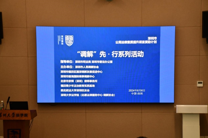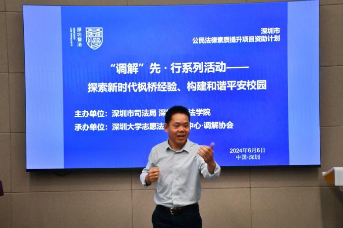 2024年6月6日,在深圳市司法局、深圳市普法办公室指导下,深圳大学法学院(志愿法律服务中心·调解协会)联合深圳市人民调解协会、深圳市福田区国深调解发展促进中心、深圳市前海国际商事调解中心、北京市京师(深圳)律师事务所、福田青少年法制教育实践基地、西北政法大学深圳校友会于明律楼102会议厅举办主题为“探索新时代枫桥经验、构建和谐平安校园”的调解主题培训活动,调解志愿者及40名法学生参会。