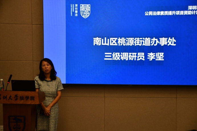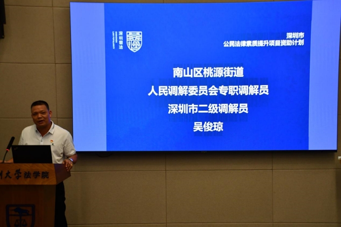 本次活动由深圳大学志愿法律服务中心负责同学苏建安主持,深圳市司法局人民参与和促进法治处副处长曾旺瑜、深圳大学法学院党委副书记林济霖、北京市京都(深圳)律师事务所律师吴小华、南山区桃源街道办事处三级调研员李坚以及深圳市二级调解员吴俊琼作为嘉宾出席。