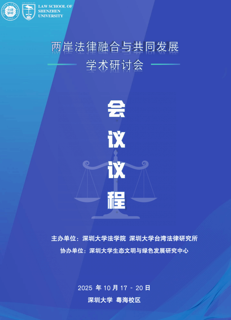 “两岸法律融合与共同发展”学术研讨会会议议程2025年10月20日开幕式每位致辞人5分钟 18日9:00 - 9:40主持人彭勃深圳大学台湾法律研究所 副所长致辞人黄奕楠深圳市人民政府台湾事务办公室交流处处长马文泽深圳大学法学院 党委书记侯玲玲深圳大学台湾法律研究所 所长,教授合影 9:40 -... -