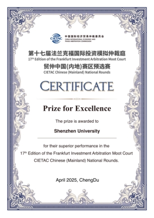 深大代表队在第17届法兰克福国际投资模拟仲裁庭-贸仲中国(内地)赛区获全国优胜奖2025年04月27日2025年4月7日至11日,第17届法兰克福国际投资模拟仲裁庭贸仲中国(内地)赛区预选赛在四川大学江安校区举行,历经三天的激烈竞赛,深圳大学代表队获得全国优胜奖,孙萱殊、夏银同学获得循环赛“最佳辩手”,李英程同学获得... -