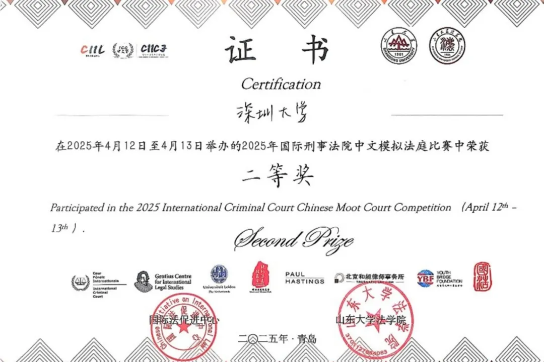 载誉而归丨深圳大学代表队在2025年国际刑事法院(ICC)中文模拟法庭竞赛中荣获全国二等奖2025年04月28日2025年4月11日~13日2025国际刑事法院(ICC)中文模拟法庭竞赛在山东大学(青岛校区)举行线下正赛深圳大学代表队荣获2025ICC中文赛全国二等奖创造了我校五年来参加ICC系列赛事的又一优异成绩!2025年4月11日至13日,2025年... -