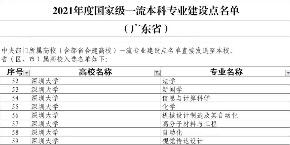 喜报!深圳大学法学专业入选国家级一流本科专业建设点2022年06月11日近日,教育部印发了《教育部办公厅关于公布2021 年度国家级和省级一流本科专业建设点名单的通知》(教高厅函〔2022〕14 号),深圳大学法学等专业入选国家级一流本科专业建设点。 -